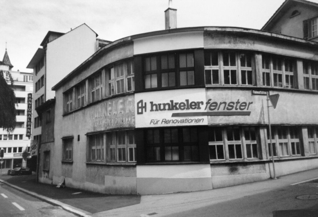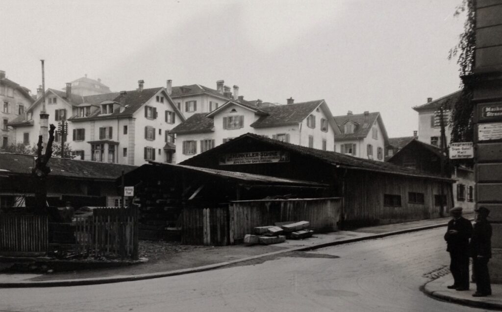 Firmenarchiv 1a hunkeler, ehemaliger Betriebsstandort am Schlossberg in Luzern vor dem Rundbau, um 1929.